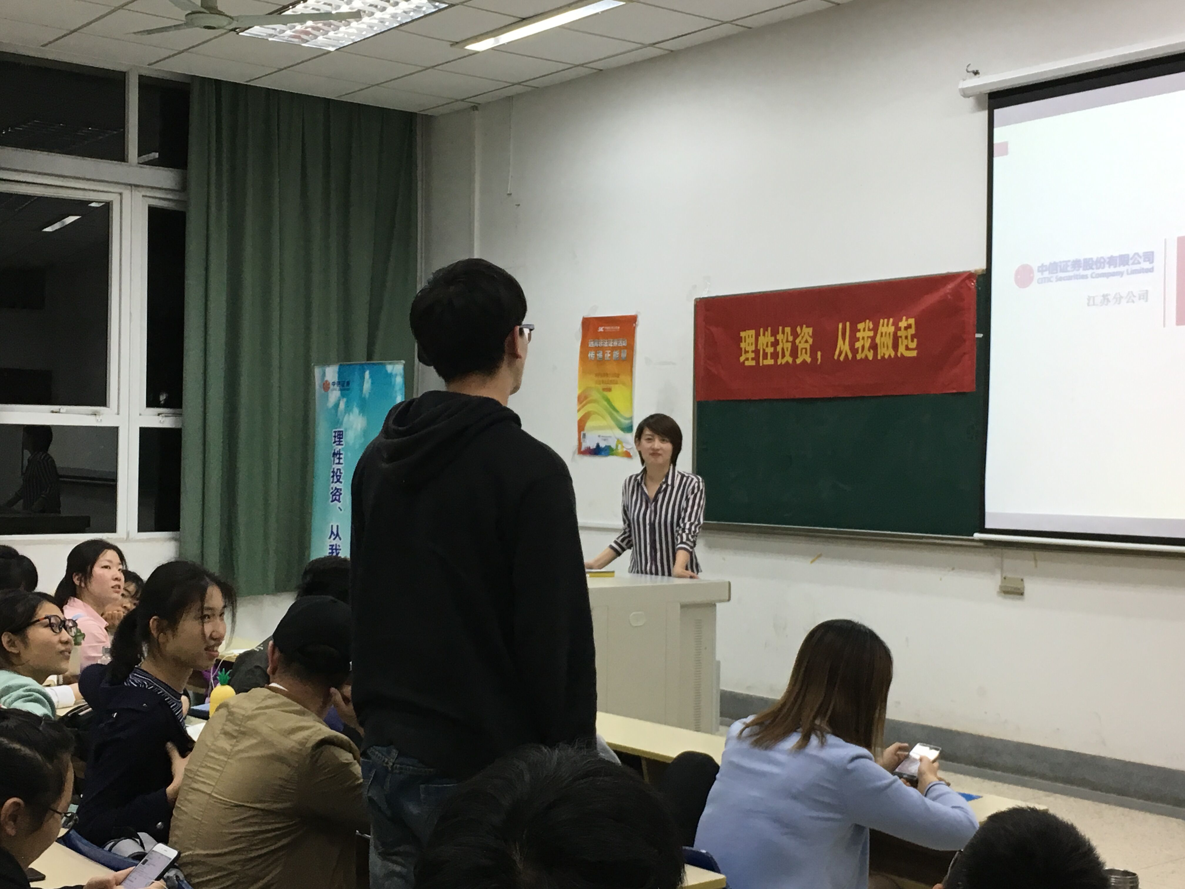 整个讲座紧紧围绕主题,中信证券的专家们首先向同学们展示了一系列投资案例并分析了其中的道理,提出同学们要理性判断自己是否具备投资股票的基本条件,呼吁大家一定要警惕社会上出现的不法分子利用证券投资进行诈骗的现象。随后,又介绍了国家在2017年颁布的《证券期货投资者适当性管理办法》,并提醒同学们作为一名投资者一定要树立风险意识,还要具备牢固的专业知识。最后,对同学们提出的疑问进行了积极而又专业的解答。