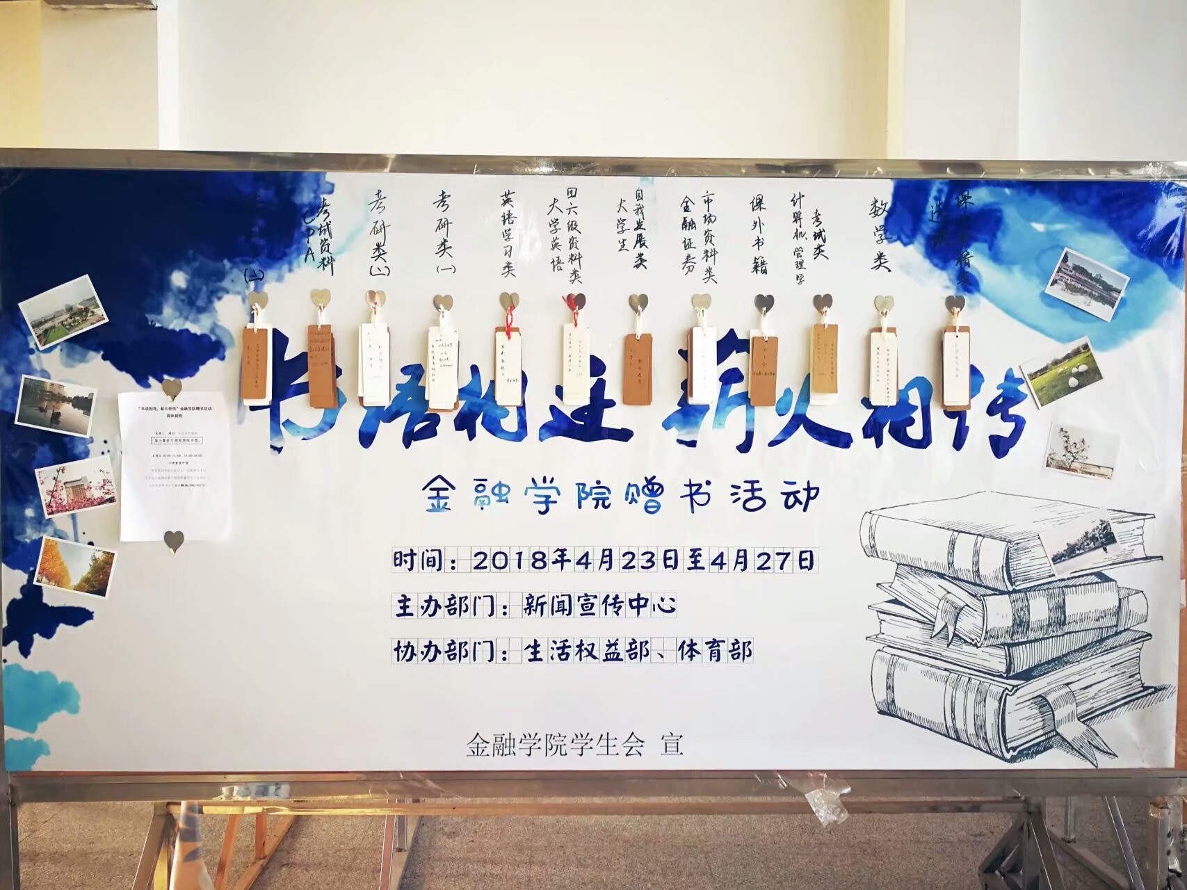 4月23至24日,久久小说 学生会成员走访各个宿管站,将收集到的书籍分门别类,再根据书名制作书签,并在背面标上序号,以便参与抽奖。