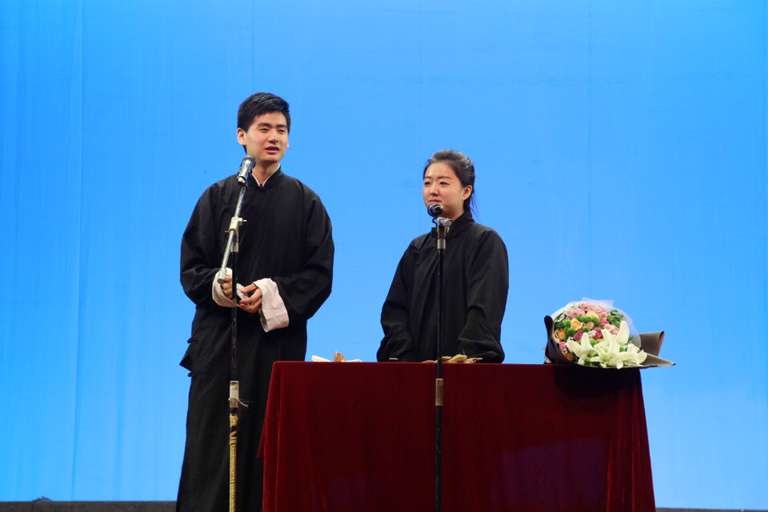 6点左右,观众陆续进入礼堂,礼堂入口处不断有人来领取抽奖号码牌。相声社老人、河海大学、南广学院等高校联盟的成员们以及久久小说 众多社团组织的同仁们也纷纷来到了现场。半小时后,在大家的热烈期盼下专场演出正式开始。首先为大家献上的是潘老师和冯老师的开场小唱《楚汉相争》,他们用歌声调动起了现场的气氛,也点燃了观众的热情!接下来就是由冯若晨、邢嘉成带来的《爱情传奇》,两个人一逗一捧,台下笑声掌声连成一片。紧接着就是潘老师和张革表演的《一言不合就穿越》,老司机潘老师一路开车,小部员张革也毫不羞涩,表演精彩到位,观众无不喜笑开怀。郑老师和周有颜带着备受观众期待的相声《量子力学与广义相对论在相声表演与创作中的指导与运用》上台了,搞笑夸张的动作,台上台下的互动,都引得观众欢呼鼓掌,堪称整场演出的高潮!接下来是群口相声《红花绿叶》,表演者史裕安、孙诗慧、姚亚东、谭媛媛,用嬉笑怒骂演绎相声中的捧逗之争,骂到浓时自然打,看得人忍俊不禁。在大家的热烈期待中压轴大戏来啦,由杨家宇、石悦带来的《对春联》一个个稀奇古怪的对子让春联变得雅俗共赏,二人相互开撕引来观众连连叫好,即使节目接近尾声,即使时间已经临近九点,现场依旧火爆。在这样热烈欢乐的气氛中我们的专场圆满结束。演出结束后,逗你玩儿相声社全体成员以及高校联盟上台合影留念,热烈祝贺第六届“相由心声—薪火相传”相声专场演出圆满成功!