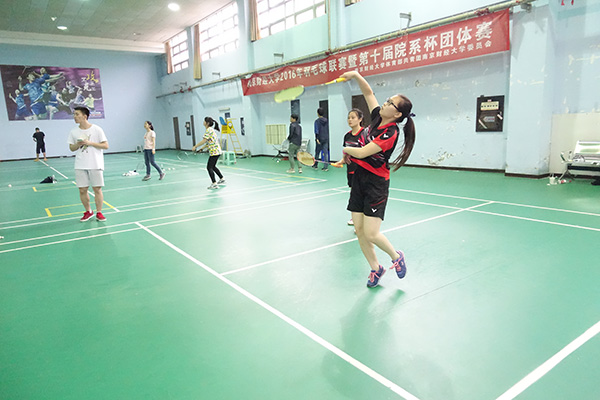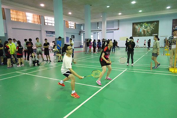 最先开始的是男单,比赛一开始金融院男生因为面对学长有点紧张,连着两次发球失误,所幸后来随着比赛的进行,金融男生逐渐找到手感,寻回自信,在比分打到3:5时开始扣杀,无奈对方学长实力比较强,金融院最后以21:11 输掉比赛。