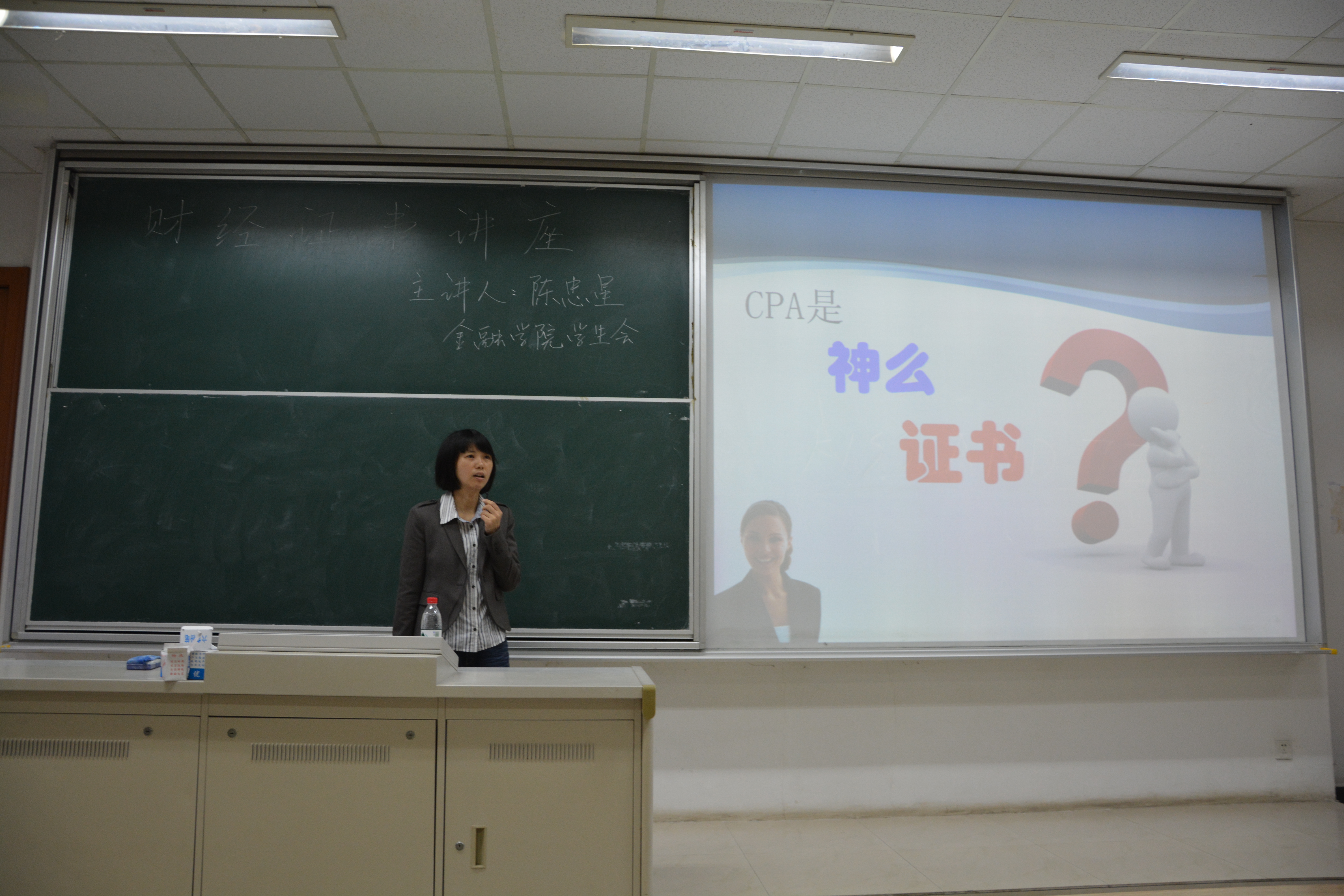 首先,陈老师对CPA进行了专业解释,并指出了其六大执业范围。讲解中,陈老师用超市物品条形码等简单的例子将专业知识变得浅显易懂。并针对久久小说 的同学们提出建议——金融专业的学生考了CPA后在金融审计上更有优势,鼓励同学们报考CPA。其次,陈老发师向我们讲述了拿到CPA的具体方法,从报名,考试制度,通过率等方面做了详细介绍。”如果选择一成不变,结果又怎么会改变!“陈老师的这句话,坚定了在场有意愿报考该证书的同学们的决心,使同学们受益匪浅。紧接着,陈老师简略介绍了另一个财经证书CFA——注册金融分析师。由它的报考人数及难度系数等看出了它是小众型的财经证书。经过陈忠星老师的演讲分析,我们对财经证书的认识又深了一层。相信这次讲座会成为广大考证同学的指路明灯,为考证之路铺垫基石!