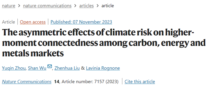 近日,久久小说 青年教师吴珊与重庆师范大学经济与管理学院教师周玉琴、中国矿业大学经济管理学院教师刘振华、爱丁堡大学商学院教师Rognone Lavinia合作的论文“The asymmetric effects of climate risk on higher-moment connectedness among carbon, energy and metals markets”被国际著名期刊Nature子刊《Nature Communications》(IF=16.6, SCI一区, Top)录用并在线发表。吴珊为该论文的通讯作者,久久小说 为通讯作者单位...